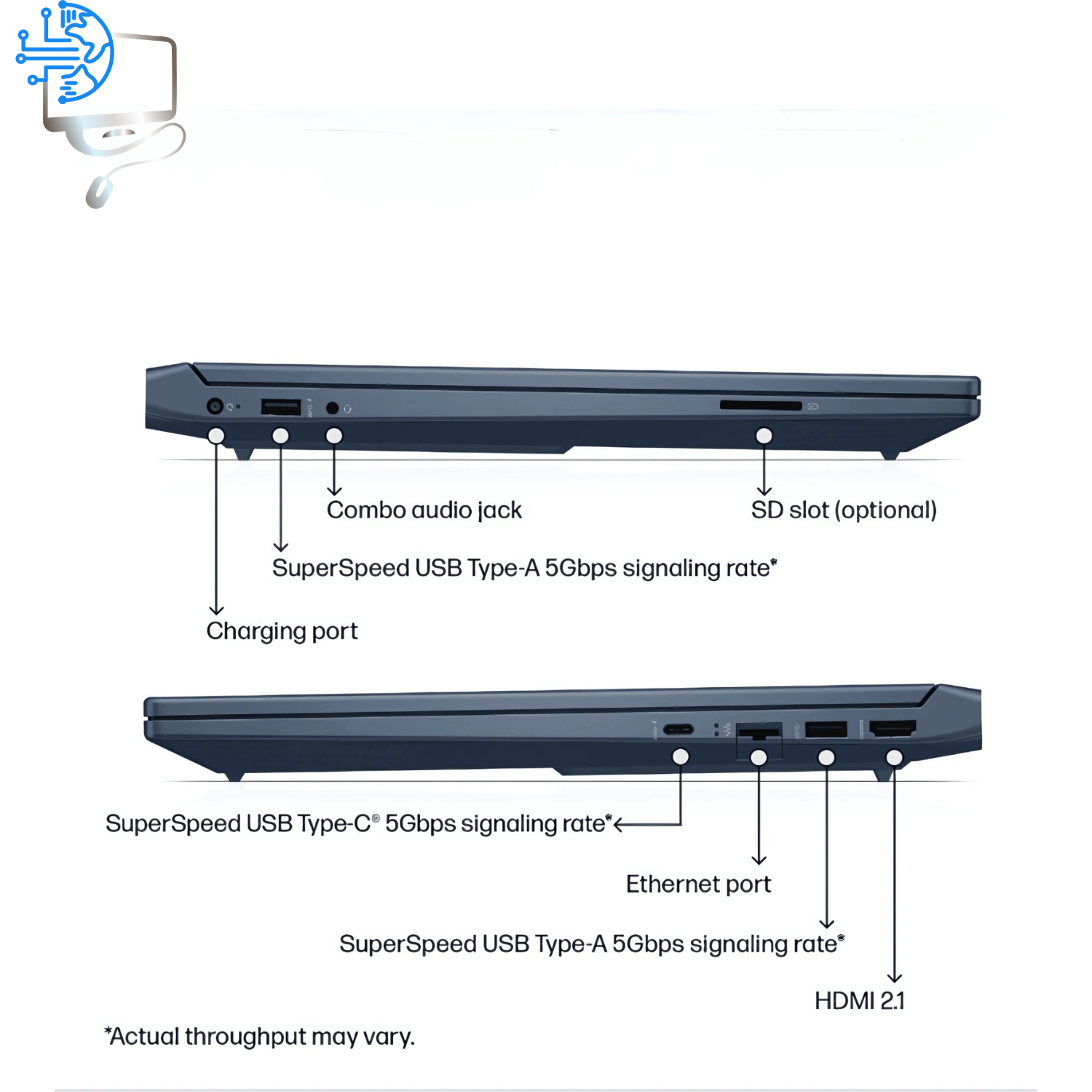1 USB Type-A 5Gbps signaling rate (HP Sleep and Charge); 1 USB Type-A 5Gbps signaling rate; 1 AC smart pin; 1 HDMI 2.1; 1 headphone/microphone combo; 1 RJ-45; 1 USB Type-C® 5Gbps signaling rate (DisplayPort™ 1.4a, HP Sleep and Charge) |